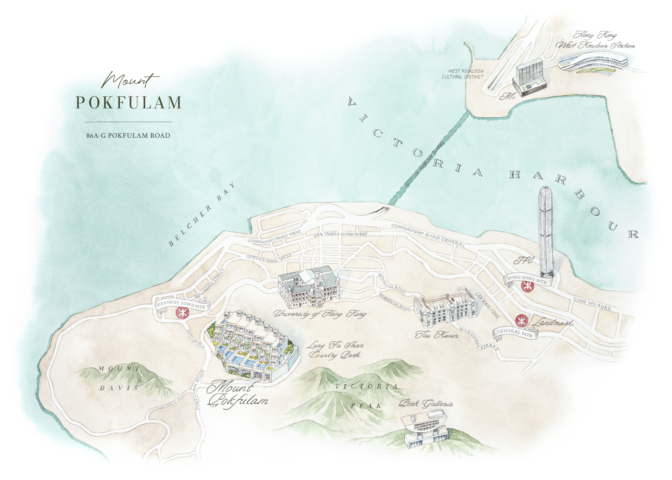 Mount Pokfulam 傲踞优越地理位置,毗邻中环和坚尼地城,融和依山而居的宁谧气氛与香港都市的动感活力。